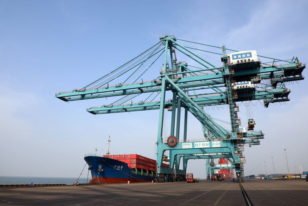 3月9日,船舶停靠在黃驊港綜合港區(qū)集裝箱碼頭進行卸船作業(yè)。新華社記者 駱學(xué)峰 攝