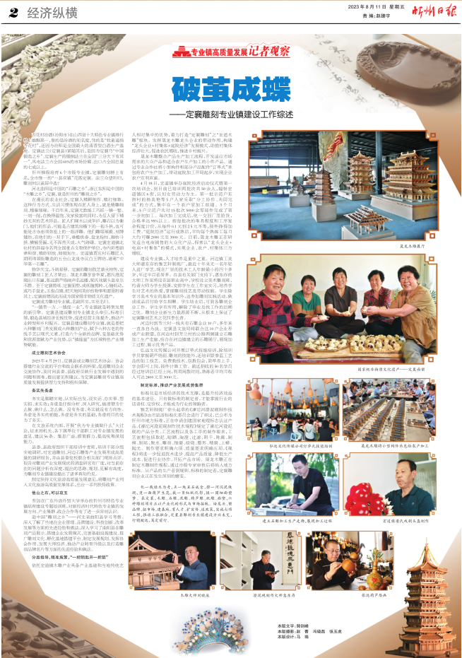 “一鎮(zhèn)帶一方、一鎮(zhèn)促一業(yè)”,專業(yè)鎮(zhèn)就是轉(zhuǎn)型發(fā)展的新引擎。定襄縣建設雕刻專業(yè)鎮(zhèn)龍頭牽引,標準引領,鍛造縣域經(jīng)濟長板優(yōu)勢,促進經(jīng)營主體提升,推動產(chǎn)業(yè)轉(zhuǎn)型和鄉(xiāng)村振興。定襄縣建設雕刻專業(yè)鎮(zhèn),就是要把六種雕刻門類發(fā)展成六種雕刻產(chǎn)業(yè),賦予六種古老的傳統(tǒng)手藝以現(xiàn)代元素,打造六個全新的品牌,變基礎優(yōu)勢和資源稟賦為產(chǎn)業(yè)優(yōu)勢,以“鎮(zhèn)能量”為區(qū)域特色產(chǎn)業(yè)增勢賦能。