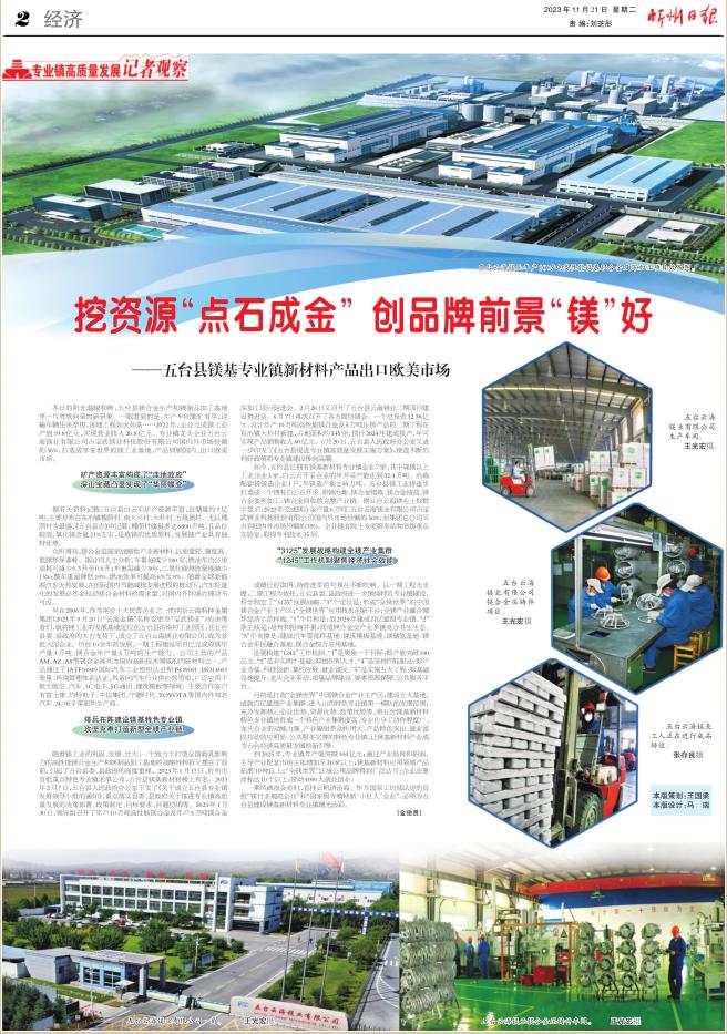 初冬時節(jié),忻州市最大的五臺云海鎂業(yè)二期項目工程在五臺縣東冶鎮(zhèn)大樸村開工建設(shè),隆隆的機械聲打破了深山溝里的沉靜。該項目總投資32.38億元、占地面積545畝、設(shè)計年產(chǎn)10萬噸高性能鎂合金及5萬噸壓鑄產(chǎn)品,預(yù)計于2024年建成投產(chǎn),年可實現(xiàn)產(chǎn)品銷售收入60億元,到2025年拉動鎂基新材料專業(yè)鎮(zhèn)年產(chǎn)值突破100億元,并打造一條擁有白云石開采、原鎂冶煉、鎂合金熔煉、鎂合金鑄造、鎂合金變形加工、鎂合金回收的完整新材料產(chǎn)業(yè)鏈,產(chǎn)品將供應(yīng)國內(nèi)市場、出口歐美市場,鏈接“全鎂世界”。