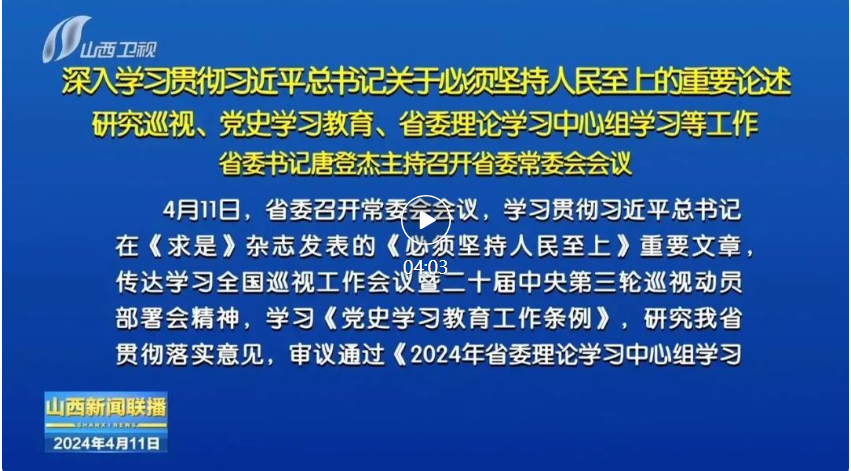 山西日報(bào)報(bào)道 4月11日,省委召開常委會會議,學(xué)習(xí)貫徹習(xí)近平總書記在《求是》雜志發(fā)表的《必須堅(jiān)持人民至上》重要文章,傳達(dá)學(xué)習(xí)全國巡視工作會議暨二十屆中央第三輪巡視動員部署會精神,學(xué)習(xí)《黨史學(xué)習(xí)教育工作條例》,研究我省貫徹落實(shí)意見,審議通過《2024年省委理論學(xué)習(xí)中心組學(xué)習(xí)計(jì)劃》。省委書記唐登杰主持會議。