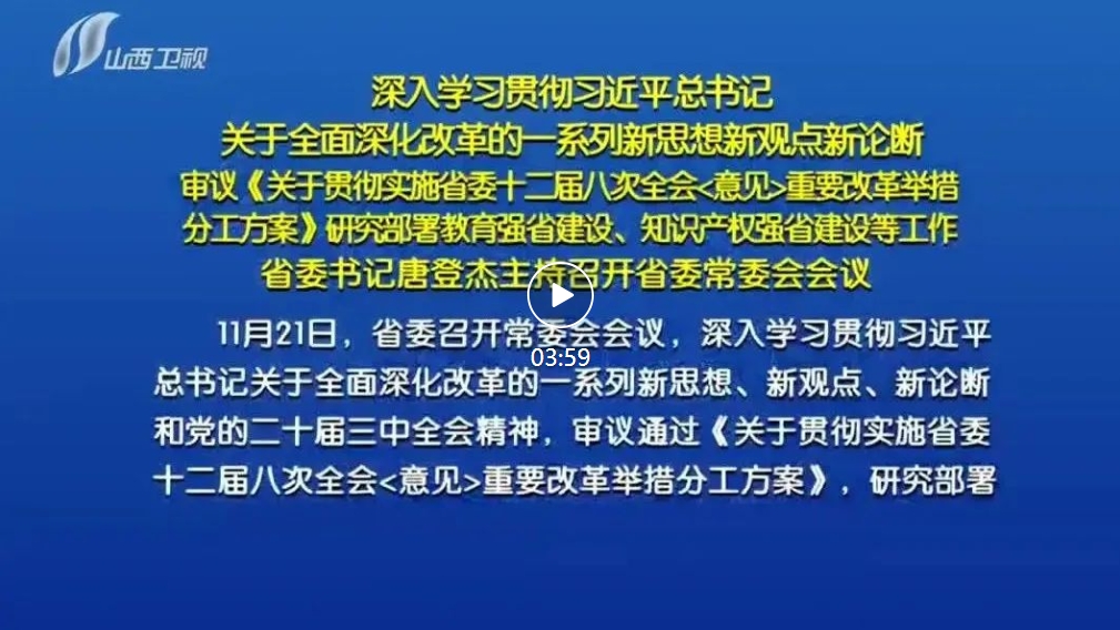 山西日報報道 11月21日,省委召開常委會會議,深入學(xué)習(xí)貫徹習(xí)近平總書記關(guān)于全面深化改革的一系列新思想、新觀點、新論斷和黨的二十屆三中全會精神,審議通過《關(guān)于貫徹實施省委十二屆八次全會〈意見〉重要改革舉措分工方案》,研究部署教育強省建設(shè)、知識產(chǎn)權(quán)強省建設(shè)等工作。省委書記唐登杰主持會議并講話。
