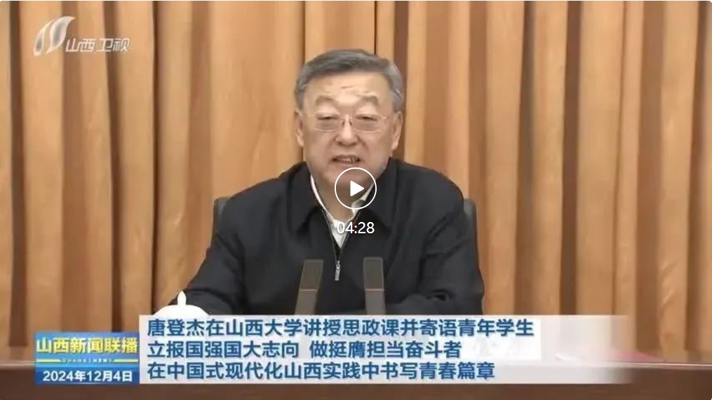 山西日?qǐng)?bào)記者陳俊琦報(bào)道 12月3日,省委書記唐登杰來到山西大學(xué)講授思政課,深入學(xué)習(xí)貫徹習(xí)近平新時(shí)代中國特色社會(huì)主義思想和黨的二十屆三中全會(huì)精神,寄語全省廣大青年學(xué)生牢記領(lǐng)袖殷殷囑托,立報(bào)國強(qiáng)國大志向、做挺膺擔(dān)當(dāng)奮斗者,在中國式現(xiàn)代化山西實(shí)踐中書寫青春篇章。省委常委、秘書長李鳳岐參加。