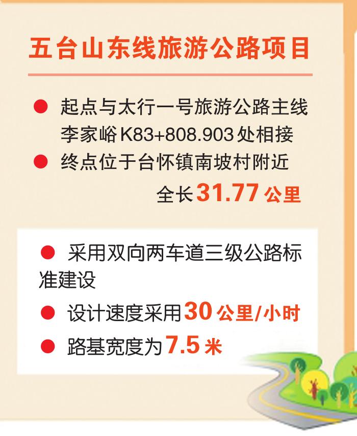 五臺(tái)山東線旅游公路起點(diǎn)與太行一號(hào)旅游公路主線李家峪K83+808.903處相接,終點(diǎn)位于臺(tái)懷鎮(zhèn)南坡村附近,全長(zhǎng)31.77公里,采用雙向兩車(chē)道三級(jí)公路標(biāo)準(zhǔn)建設(shè),設(shè)計(jì)速度采用30公里/小時(shí),路基寬度為7.5米。項(xiàng)目實(shí)施圍繞“扶貧、旅游、生態(tài)、人文、研學(xué)”等核心宗旨,著力提升五臺(tái)山風(fēng)景名勝區(qū)旅游公路的通行能力與服務(wù)水平,強(qiáng)化“交通+旅游”與“經(jīng)濟(jì)增長(zhǎng)”的導(dǎo)向作用。