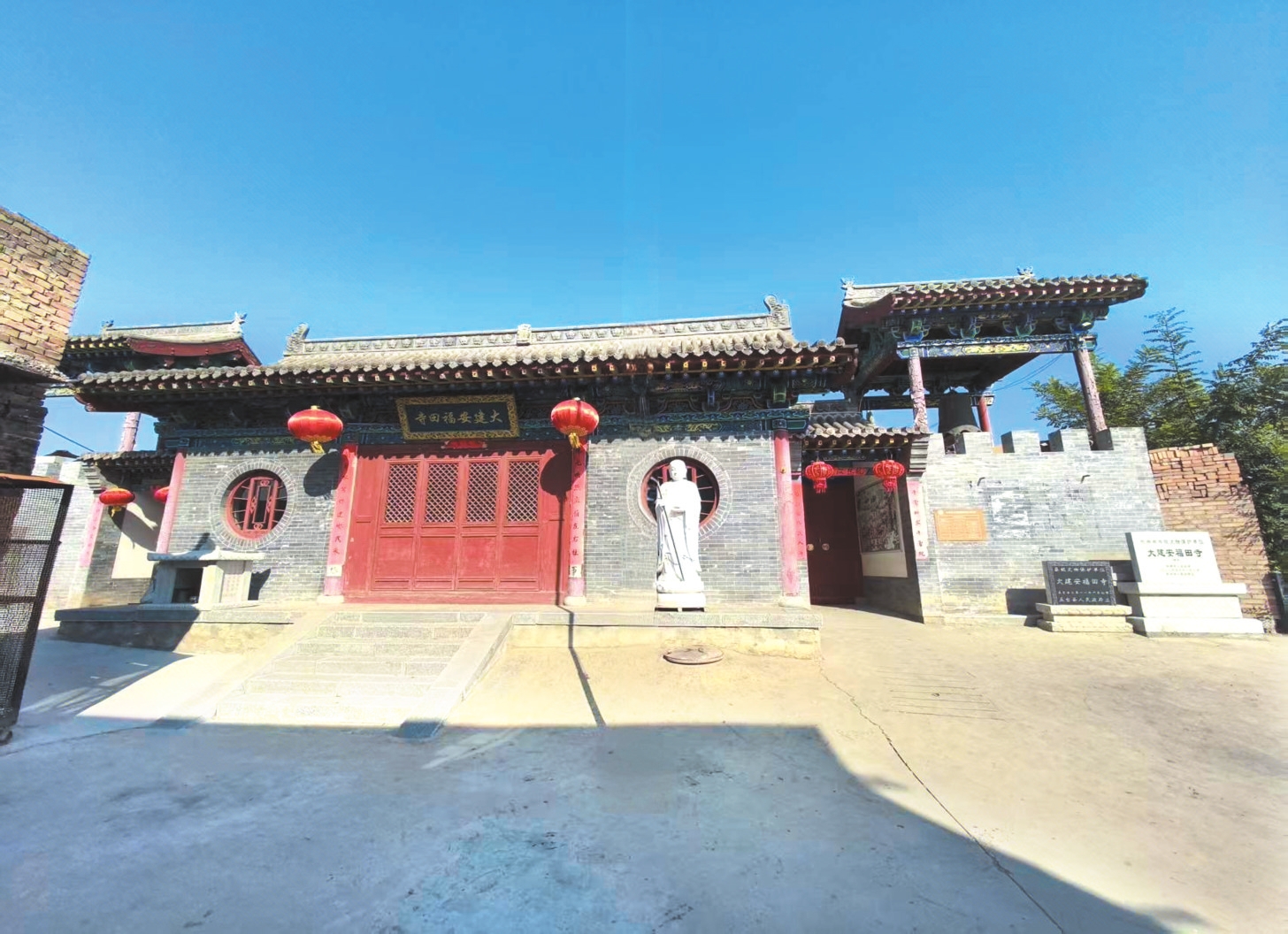大建安福田寺位于五臺(tái)縣建安鄉(xiāng)大建安村委會(huì)東北約341米。據(jù)正殿脊剎題記載,“大明正德九年(1514)四月四日落成”。坐北向南,四合院落布局,占地面積594.931平方米。除正殿為明代遺構(gòu)外,余均為新建。正殿大雄寶殿面寬三間,進(jìn)深四椽,前檐方椽,單檐懸山頂。當(dāng)心間為六扇隔扇門(mén),兩次間為方窗,柱頭斗拱五踩雙下昂,樺頭子。當(dāng)心間平身科出兩跳斜拱,兩次間平身科五踩雙下昂,樺頭子。斗拱間拱眼壁上繪“南無(wú)阿彌陀佛”六字,殿內(nèi)為徹上明造,梁枋彩繪,主供華嚴(yán)三圣。東西壁上于2008年新繪十八羅漢,北壁繪阿難、迦葉53.3平方米。西朵殿三間,平房;東朵殿兩間,平房。東西配殿均為2006年新建,新繪十殿閻君壁畫(huà)22.5平方米。福田寺大建安的歷史沿革豐富而悠久,其大殿展現(xiàn)了明清建筑的獨(dú)特風(fēng)格與特色。這座大殿的形制古樸典雅,斗拱的造型精致美觀,成為了明清時(shí)期歷史的生動(dòng)見(jiàn)證。