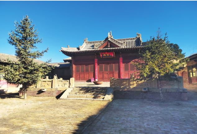一進(jìn)院布局,中軸線現(xiàn)存有正殿1棟,兩側(cè)建有配殿,西北角建有偏殿。正殿磚砌臺基,面寬五間,進(jìn)深六椽,七檁前后廊式構(gòu)架,前檐斗拱為五踩,后檐為三踩斗拱,單檐懸山頂。前設(shè)月臺,建有抱廈三間,單檐歇山頂。現(xiàn)新塑像3尊,正殿梁架有彩繪。