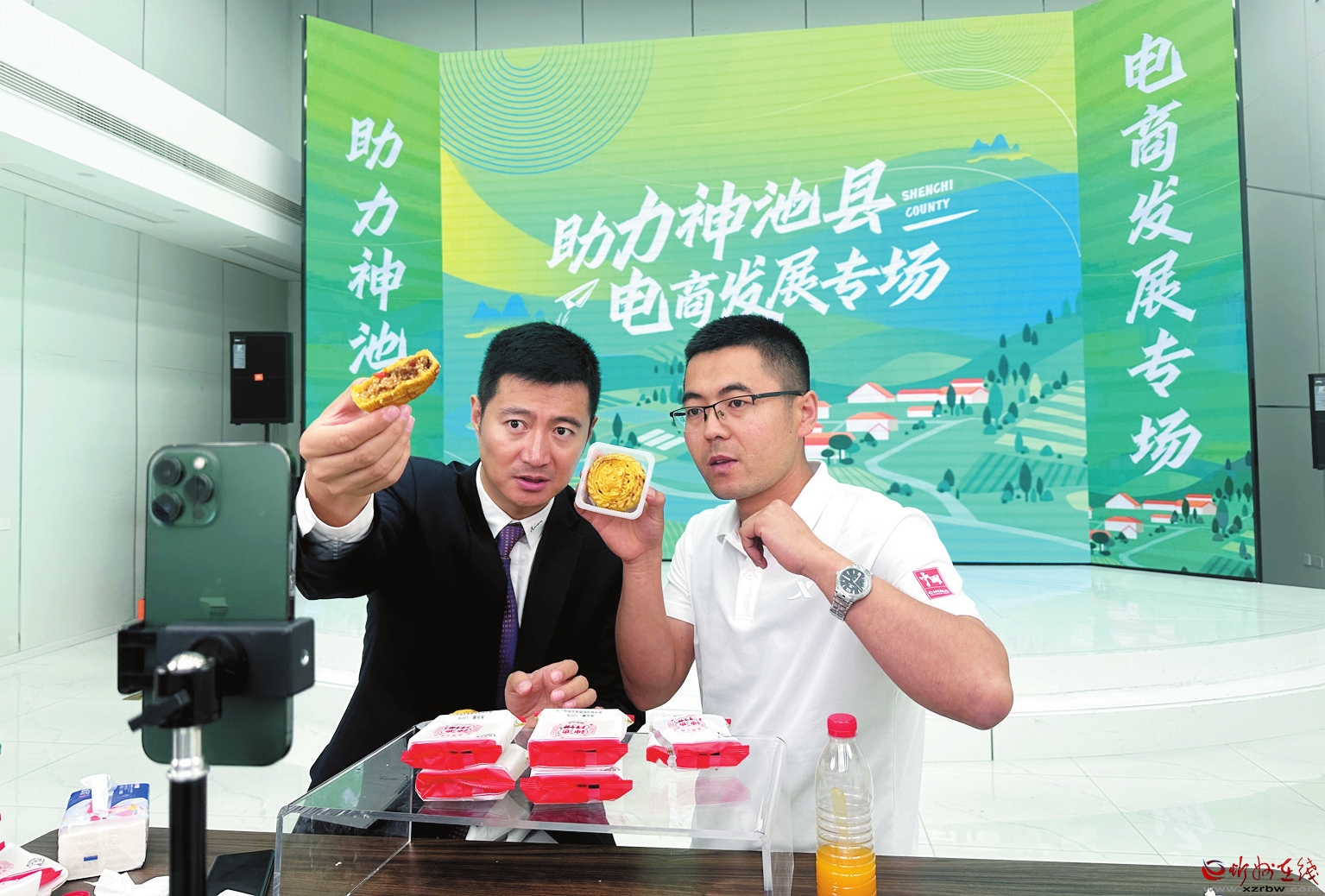知名網紅王寶(左)與神池兄弟月餅青年主播高永勝(右)共同直播銷售神池餅。 鄭志東攝