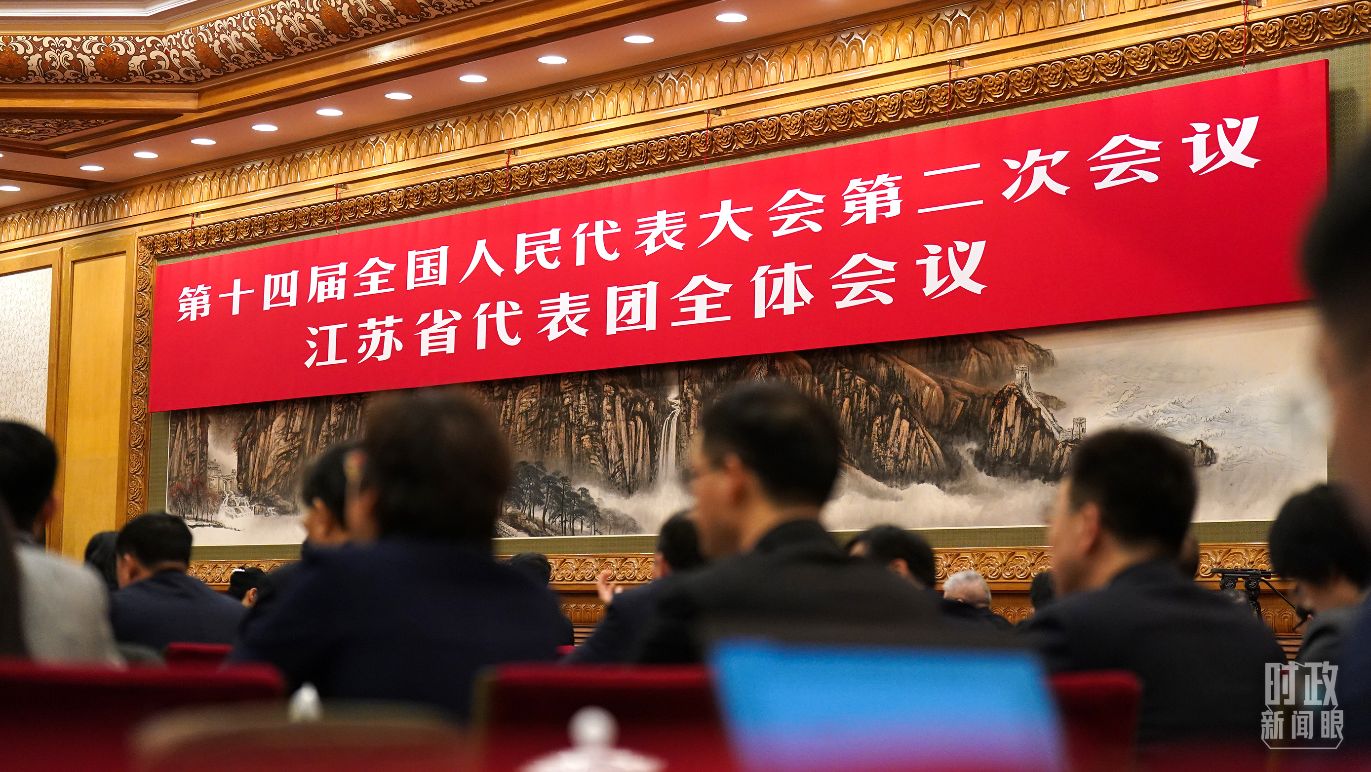 △江蘇代表團(tuán)全體會(huì)議,會(huì)標(biāo)醒目。(總臺(tái)國(guó)廣記者李晉拍攝)