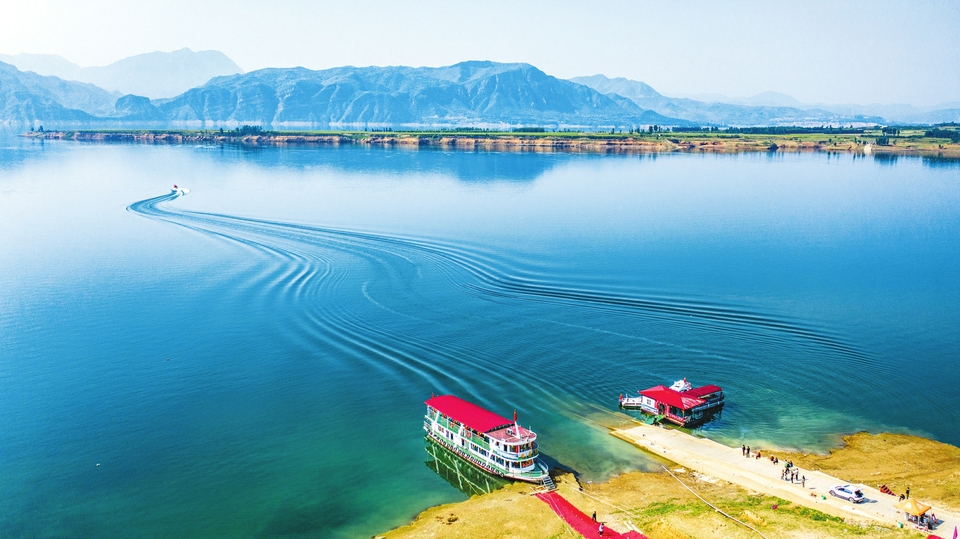 5月5日,在垣曲縣古城國家濕地公園內(nèi),游客或乘游輪、或乘快艇,游覽濕地如詩如畫美景,樂享假日。近年來,隨著當?shù)丶哟鬂竦亻_發(fā)與保護力度,黃河濕地生態(tài)環(huán)境得以明顯改善,生態(tài)文明建設成果更好地惠及人民。