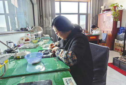 稷山螺鈿漆器髹飾技藝代表性傳承人李愛珍正在專心創(chuàng)作。