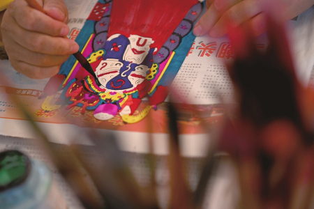 這么有趣的剪紙作品又是如何誕生的呢?走進該博物館剪紙制作車間,只見學(xué)員們手中的刻刀上下跳動,一件件精美的剪紙作品雛形便逐漸顯現(xiàn)?!耙患艏堊髌返闹谱鹘^對不是靠簡簡單單的一把剪刀、一張紅紙就可以完成的,它要經(jīng)歷設(shè)計、刀刻、顏染、裝裱4個大步驟38個小步驟?!辈┪镳^講解員曹慧中指著剪紙學(xué)員對眾人說,“他們正在進行的是刀刻這一道工序,我們不要求每個人每個工序都會都熟練,熟練的剪紙藝人制作一件剪紙作品也得花費一天時間,剪紙的制作需要團結(jié)協(xié)作而不是單打獨斗?!?/p>