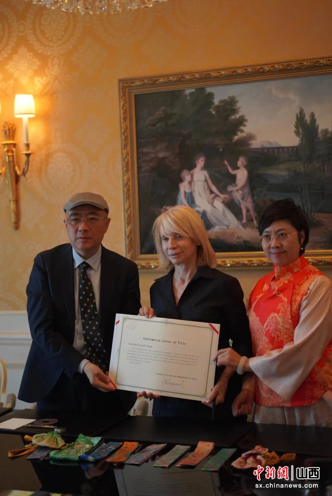 潞綢技藝傳承人、潞安府潞綢集團(tuán)董事長王淑琴,太湖世界文化論壇常務(wù)理事、中國琺華技藝傳承人于山向巴黎名媛舞會(huì)創(chuàng)始人奧菲莉·雷努阿贈(zèng)送潞綢、琺華工藝品。