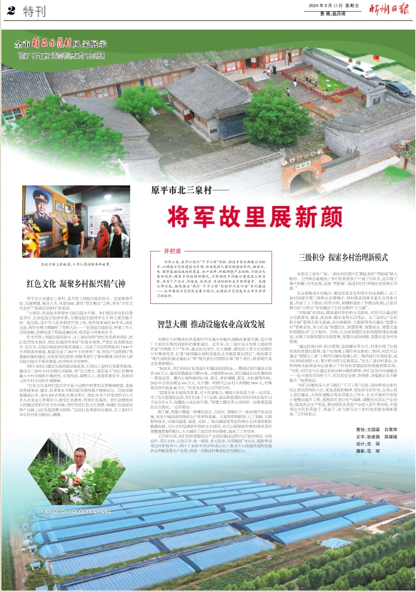 今年以來,我市以踐行“千萬工程”經(jīng)驗、推進鄉(xiāng)村全面振興為抓手,以精品示范村建設(shè)為引領(lǐng),加快農(nóng)村人居環(huán)境整治步伐,推動水、電、路等基礎(chǔ)設(shè)施向村覆蓋、向戶延伸;積極調(diào)整產(chǎn)業(yè)結(jié)構(gòu),不斷壯大集體經(jīng)濟;探索鄉(xiāng)村治理新模式,不斷推進鄉(xiāng)村振興建設(shè)邁上新臺階,書寫了產(chǎn)業(yè)興、環(huán)境美、民風(fēng)淳、生活好的和美鄉(xiāng)村新篇章。本報從即日起,陸續(xù)推出“踐行‘千萬工程’經(jīng)驗忻州在行動”系列報道——全市精品示范村風(fēng)采展示特刊,讓精品示范村成為全市鄉(xiāng)村學(xué)習(xí)的標(biāo)桿。