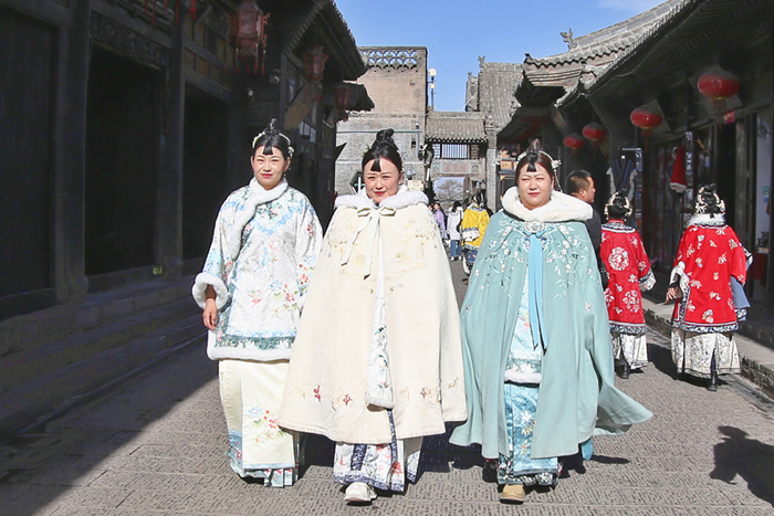 游客裝扮成晉商少奶奶,走在平遙古城里。記者錢龍攝