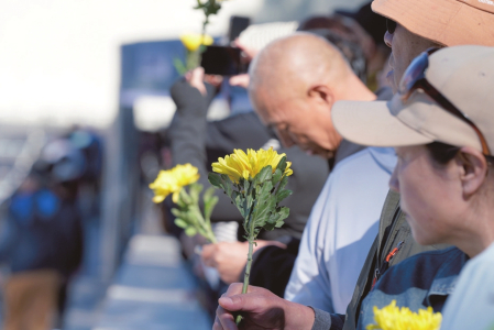 圖③、圖④:9月18日,在哈爾濱市的侵華日軍第七三一部隊(duì)罪證陳列館外,人們?cè)诜揽站瘓?bào)鳴響時(shí)肅立默哀。