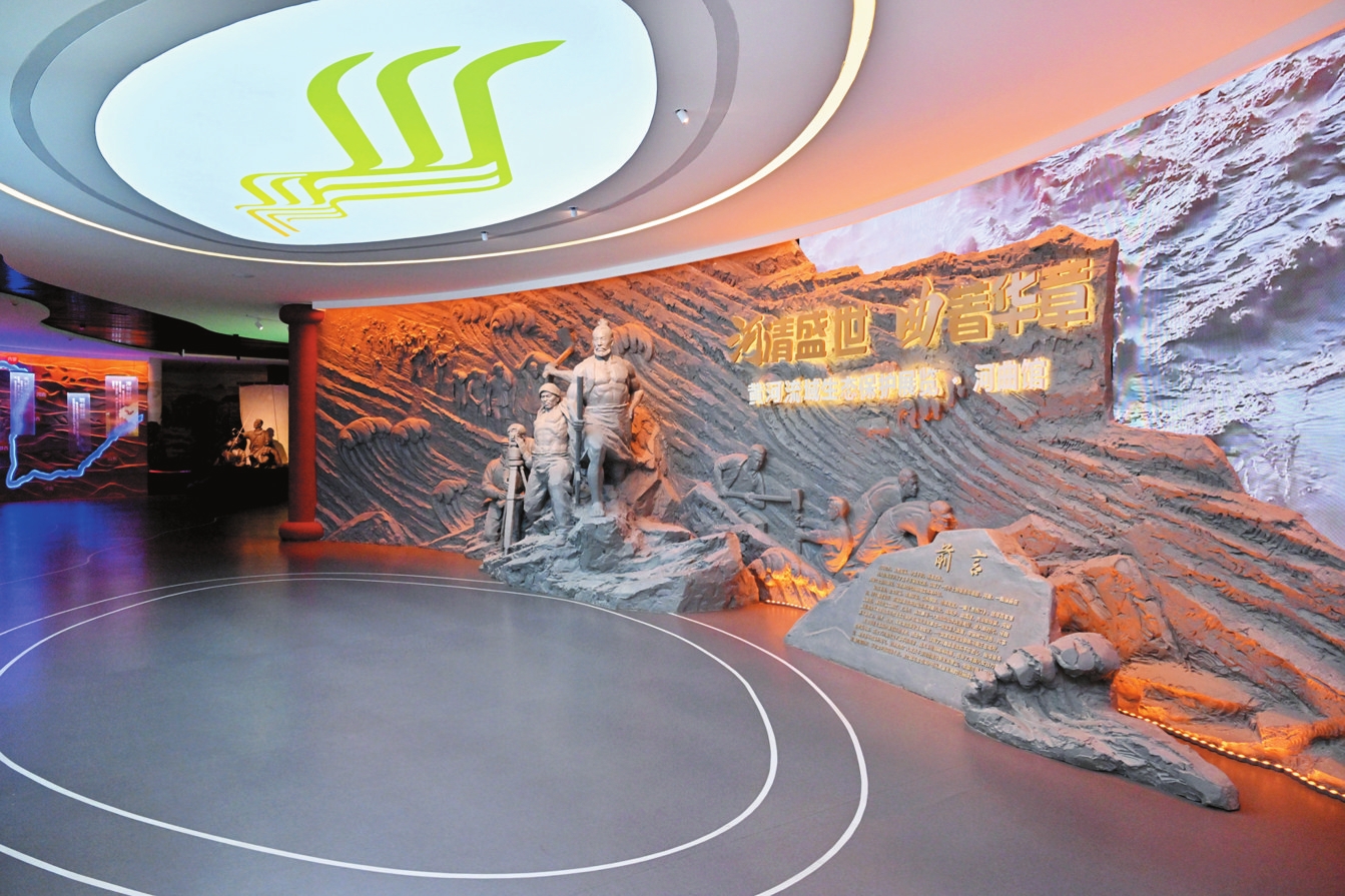 在第五篇章“大河之夢·生態(tài)和諧”展區(qū)的弧幕影院里,《河清盛世曲著華章》主題影片展現(xiàn)著新時(shí)代圖景:國家園林縣城的林蔭道上,光伏板與古長城交相輝映;黃河濕地公園里,黑鸛與白天鵝掠過水面;整溝治理后的山坡上,民宿集群飄起裊裊炊煙。